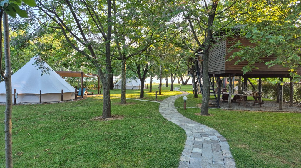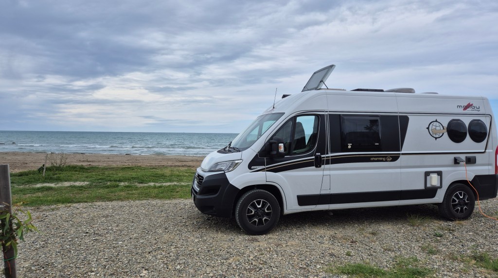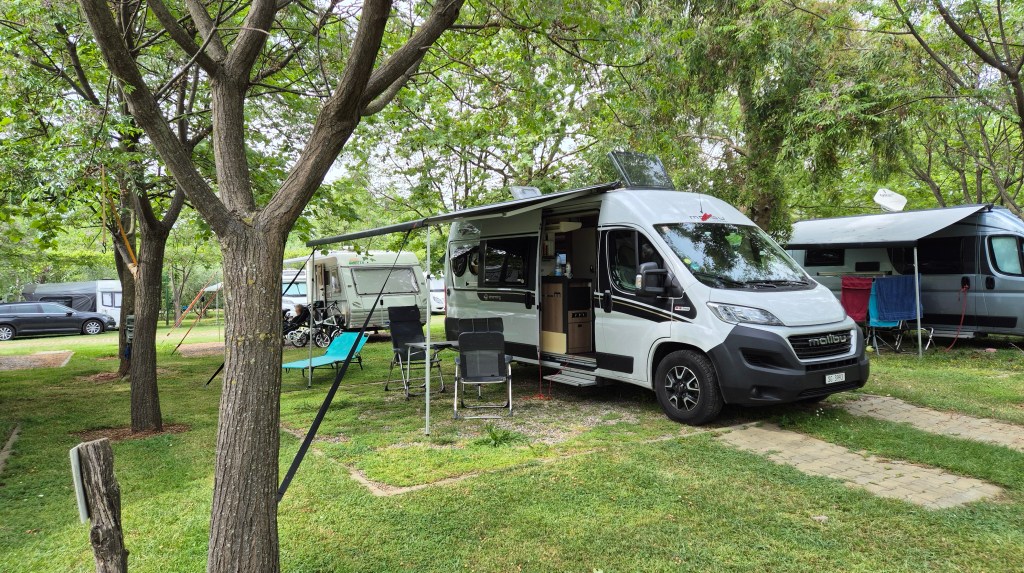 Der Campingplatz befindet sich unmittelbar an einer Strasse, angrenzend an ein Restaurant. Die Einfahrt ist leicht zu übersehen. Hinter dem Restaurant entsteht derzeit ein grosszügig angelegter Camping- und Wohnmobilstellplatz. Für die Stadtbesichtigung organisierten wir über das Restaurant ein Taxi, das uns direkt ins Stadtzentrum brachte. Für die Rückfahrt kontaktierten wir die örtliche Taxizentrale, welche uns ebenfalls ein Fahrzeug in das Zentrum schickte. Mittels SMS wurden wir über das Eintreffen unseres bestellten Taxis informiert. Bei den eingesetzten Fahrzeugen handelt es sich um VW ID.6 – ausschliesslich Elektrofahrzeuge. Die Mitnahme unseres Hundes stellte keinerlei Probleme dar.