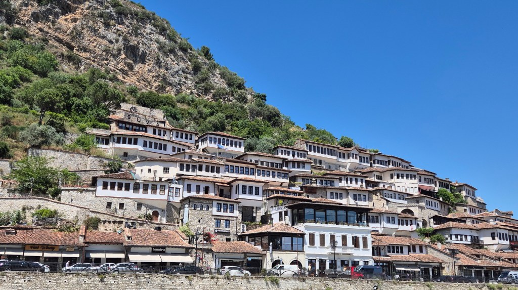 Berat ist eine der ältesten und schönsten Städte Albaniens, bekannt als die „Stadt der tausend Fenster“ und seit 2008 UNESCO-Weltkulturerbe. Sie liegt malerisch am Fluss Osum und besticht durch ihre weissen Häuser mit grossen Fenstern, die sich dicht an den Hang schmiegen.